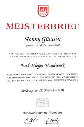 Am 1. August 1993 begann Herr Ronny Günther seine Ausbildung im Parkettlegerhandwerk in diesem Unternehmen und wurde am 1. April 2000 zum Teilhaber der Firma, die gleichzeitig in Schauer u. Günther Parkett GmbH umbenannt wurde. Ende des Jahres 2001 erwarb Herr Günther den großen Befähigungsnachweis für das Parketthandwerk und krönte seine berufliche Laufbahn mit dem Meistertitel. Seit Anfang 2011 trägt die Firma stolz den Namen Günther & Sohn Parkett GmbH. Aktuell beschäftigt das Unternehmen zwei Gesellen, einen Meister und eine Bürokauffrau, die gemeinsam dafür sorgen, dass die Tradition und Qualität des Parkett-Handwerks fortbestehen.